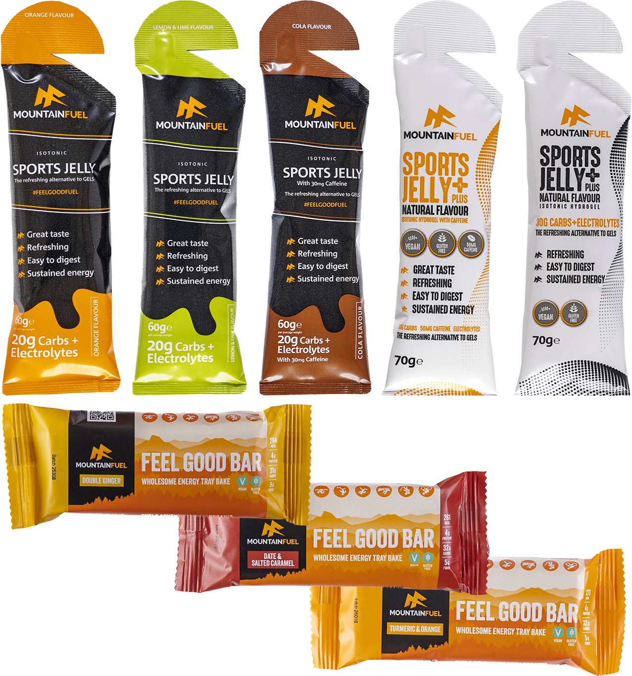 The pack contains 1 x Date FeelGoodBar, 1 x Double Ginger FeelGoodBar, 1 x Turmeric & Orange FeelGoodBar, 1 x Orange Sports Jelly, 1 x Lemon & Lime Sports Jelly and 1 x Cola with caffeine Sports Jelly 1 x Natural Sport Jelly+ with caffeine, 1 x Natural Sport Jelly+